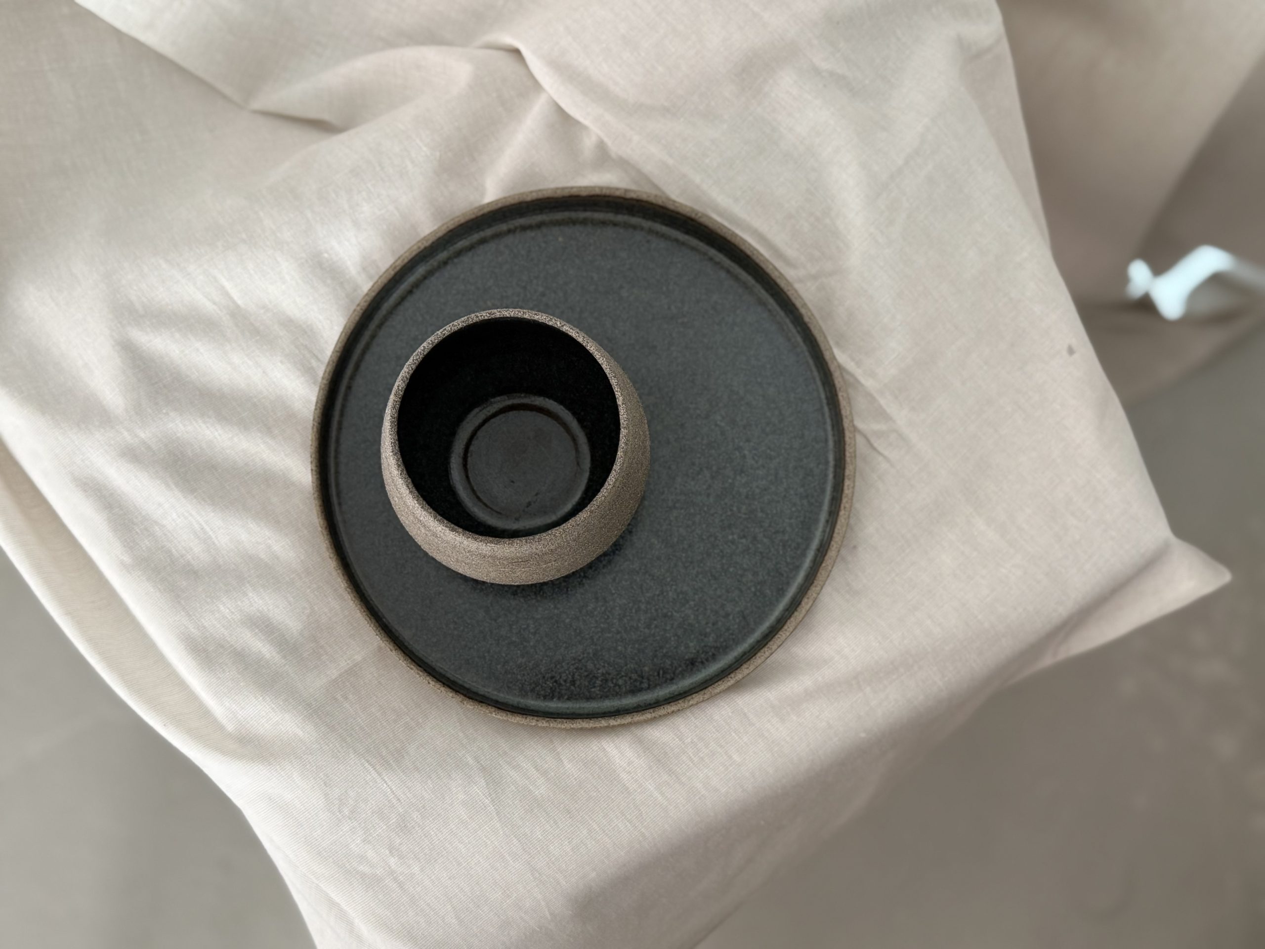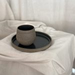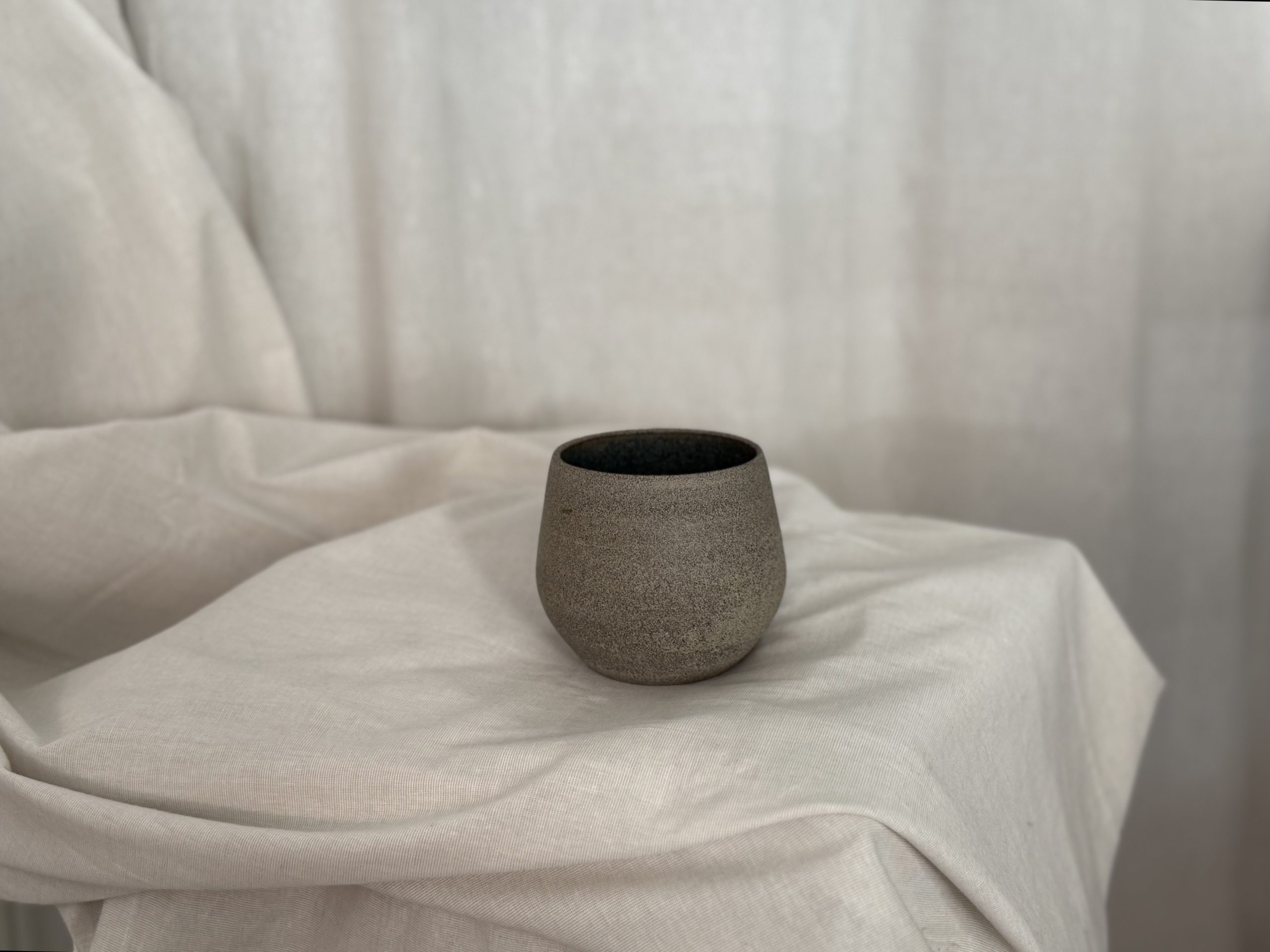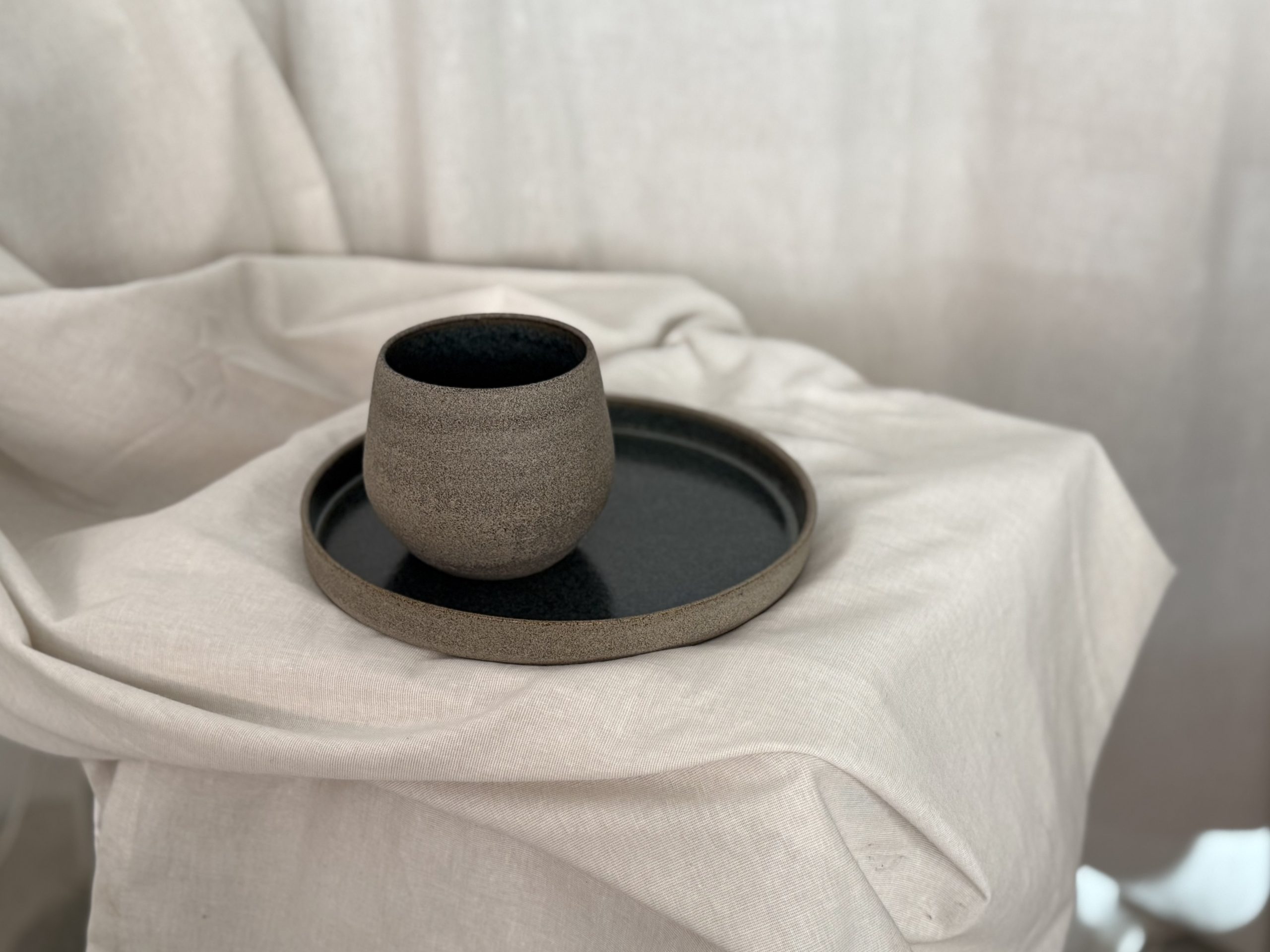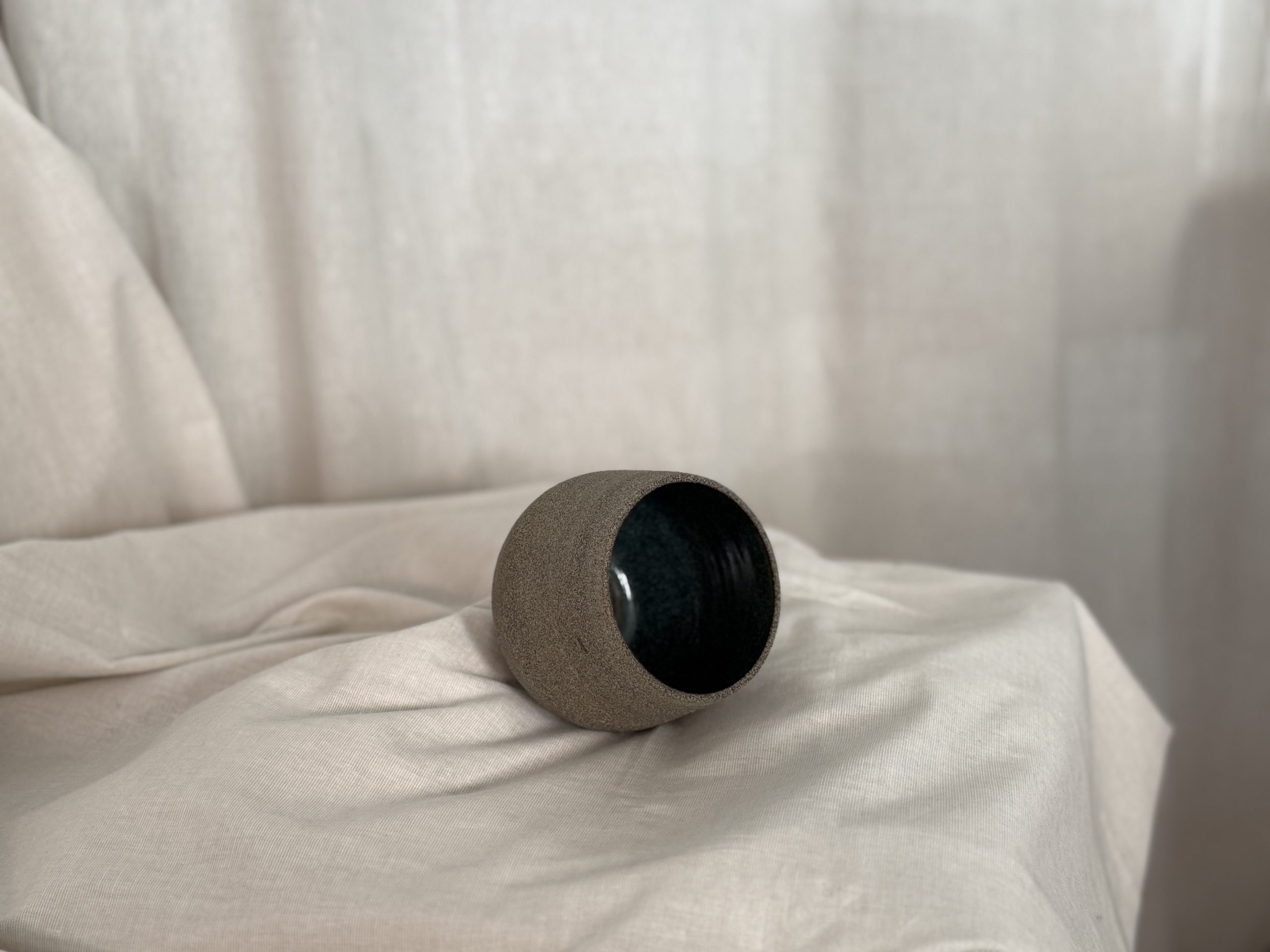 Preproste a edinstvene skodelice brez ročaja. Izdelane iz sive kamenine,in v notranjosti prekrite z modro sijaj glazuro.