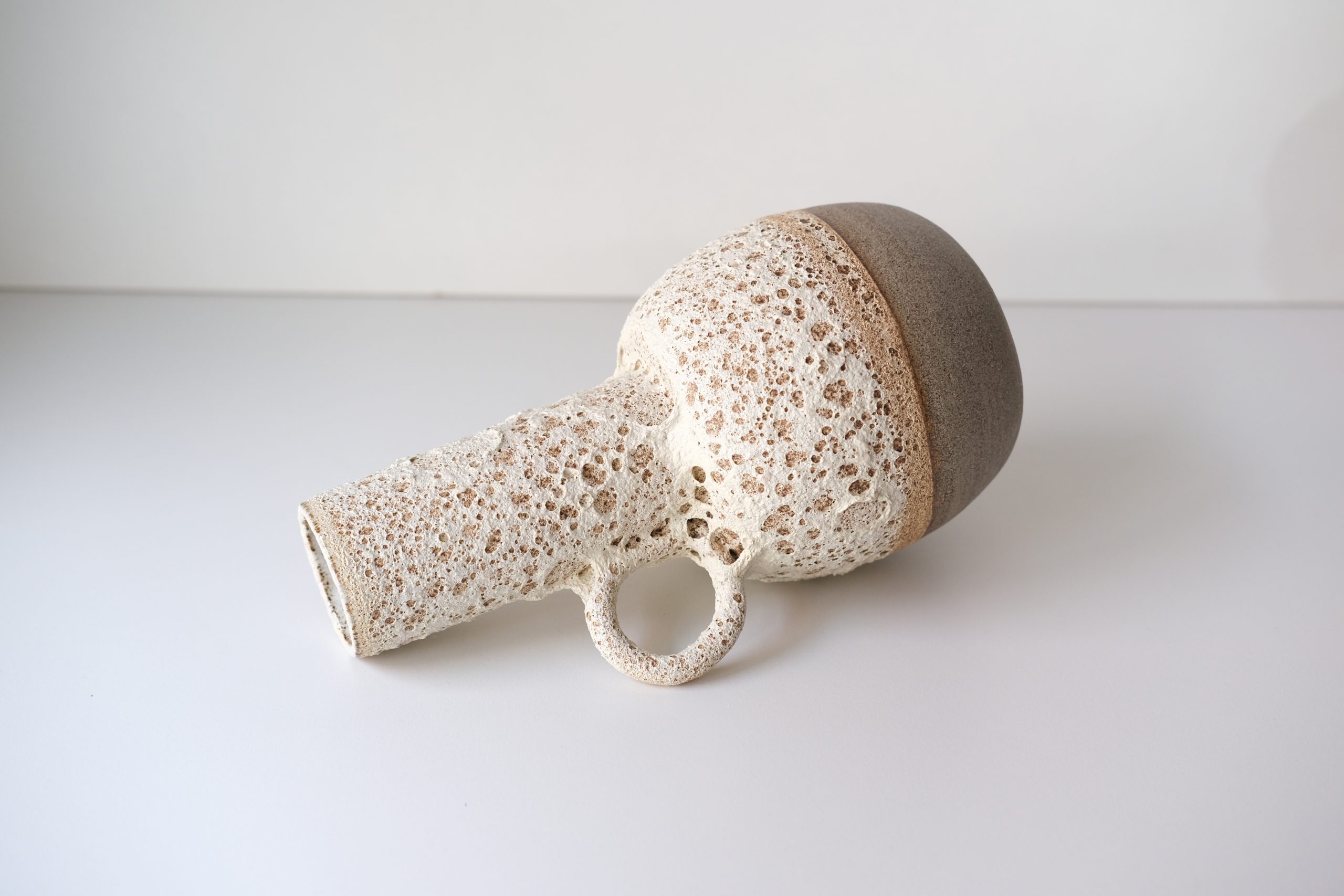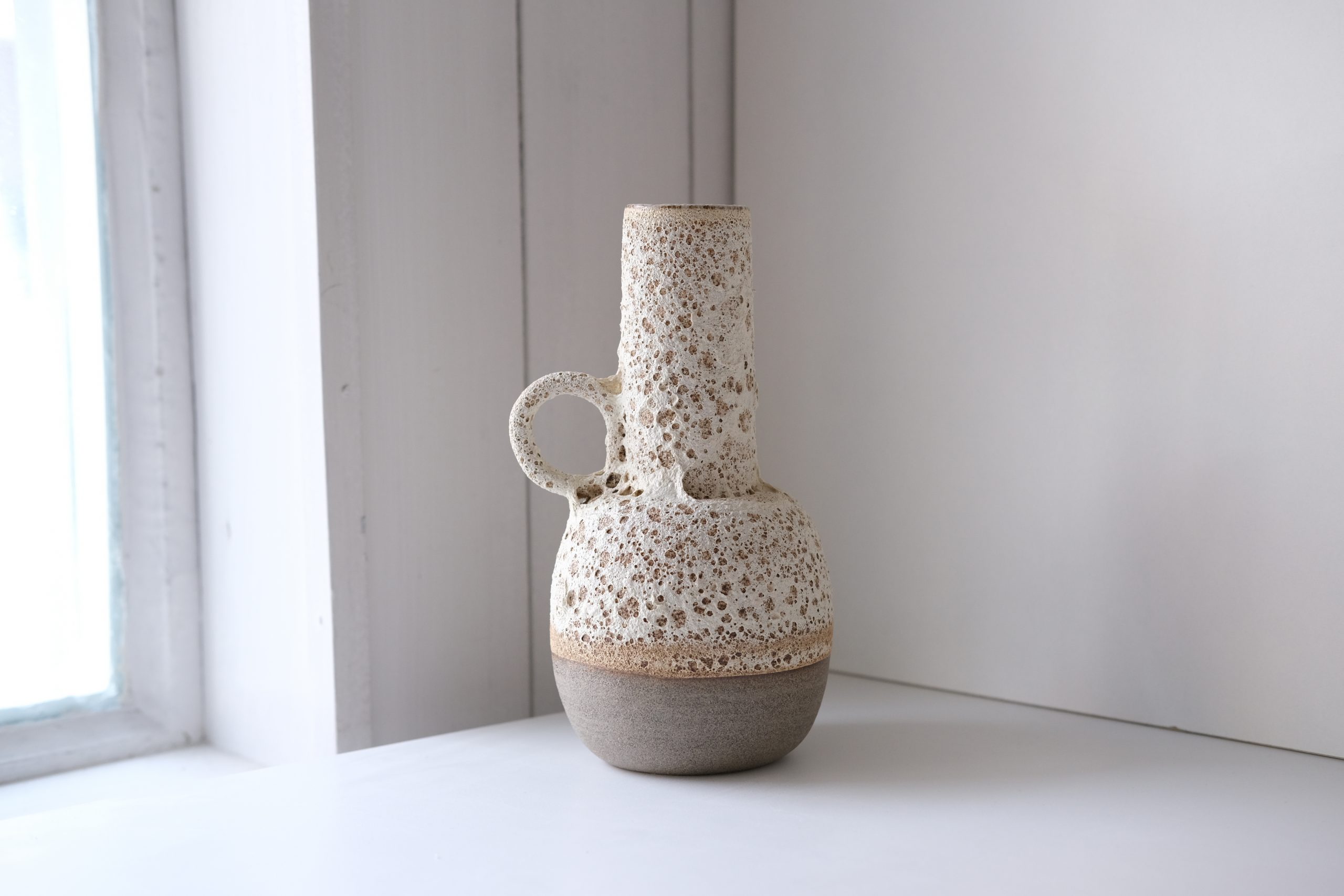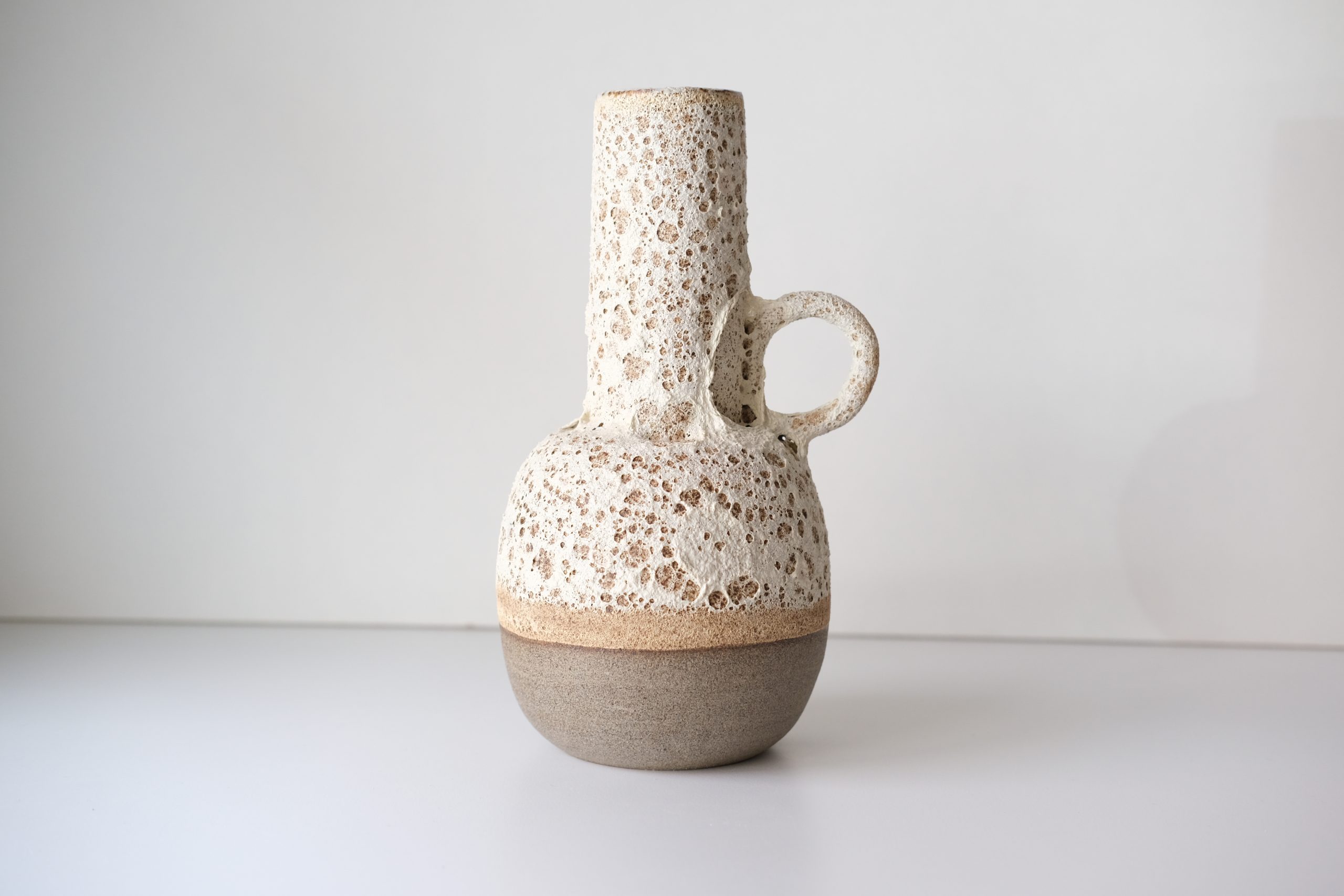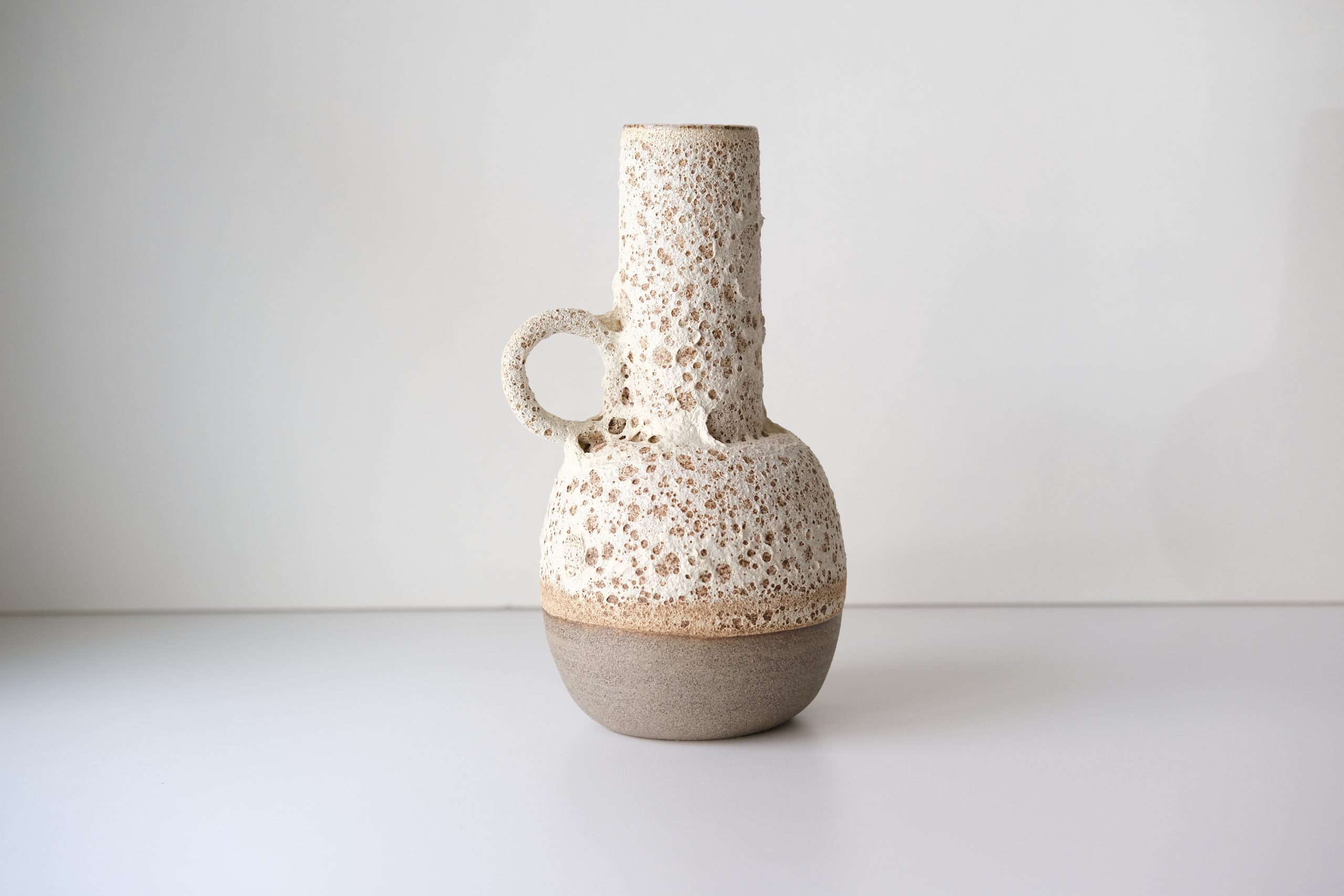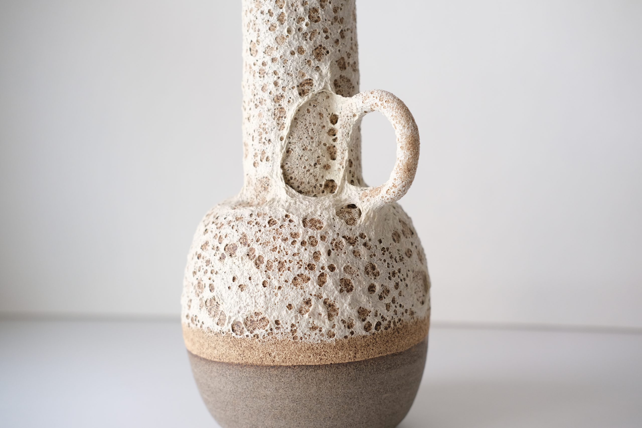 Moderno oblikovana vaza z ročajem, prekrita z teksturirano glazuro.